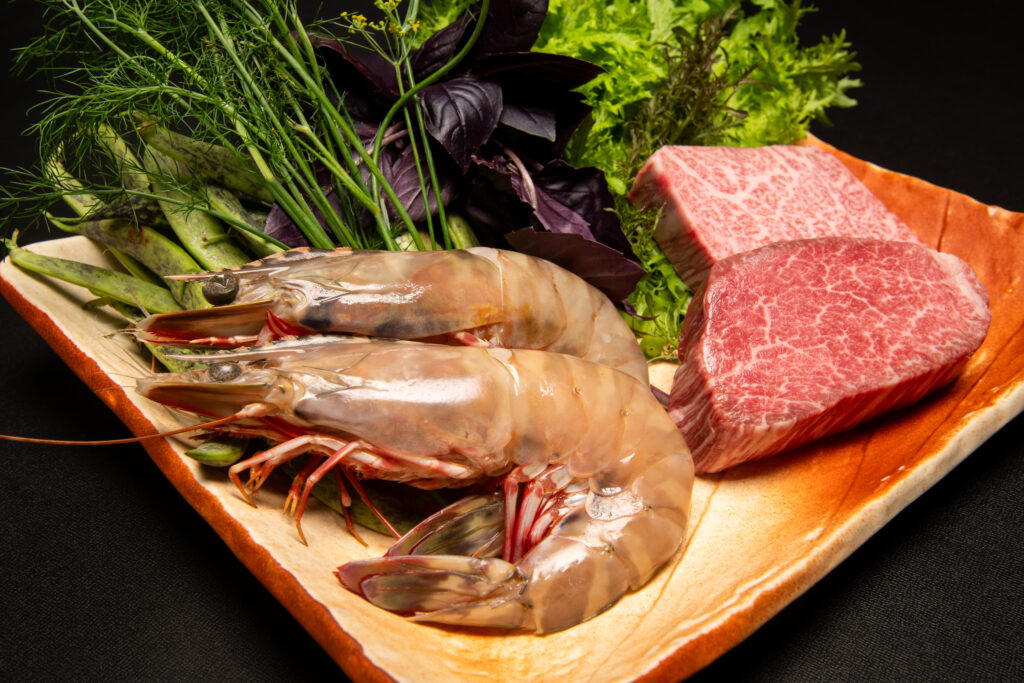 A5ランク黒毛和牛ステーキ、有頭エビ海老の香草焼き