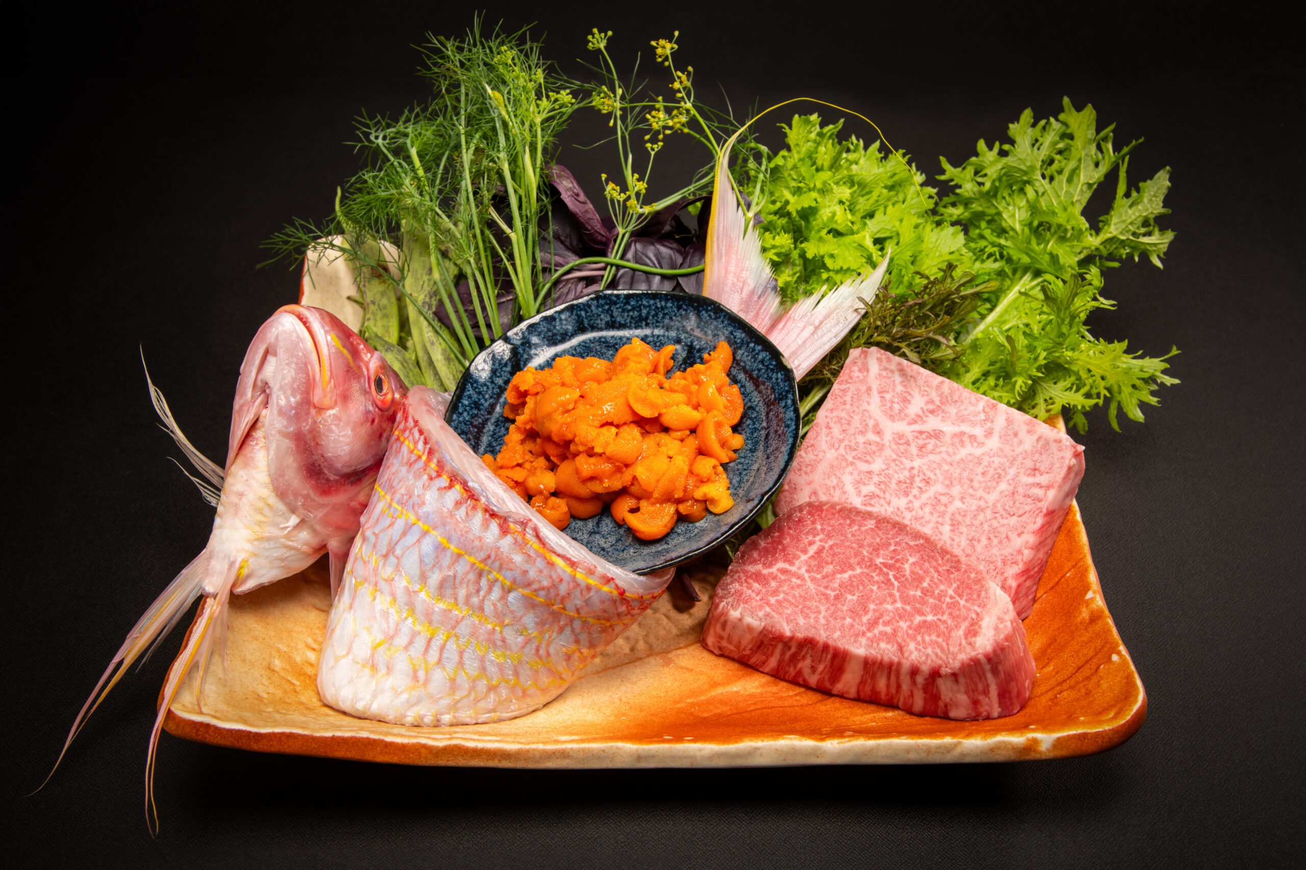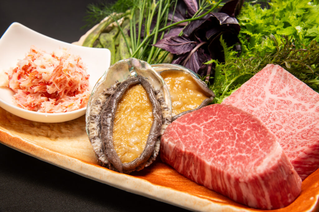 A5ランク黒毛和牛ステーキにずわい蟹・鮑の鉄板焼きなど