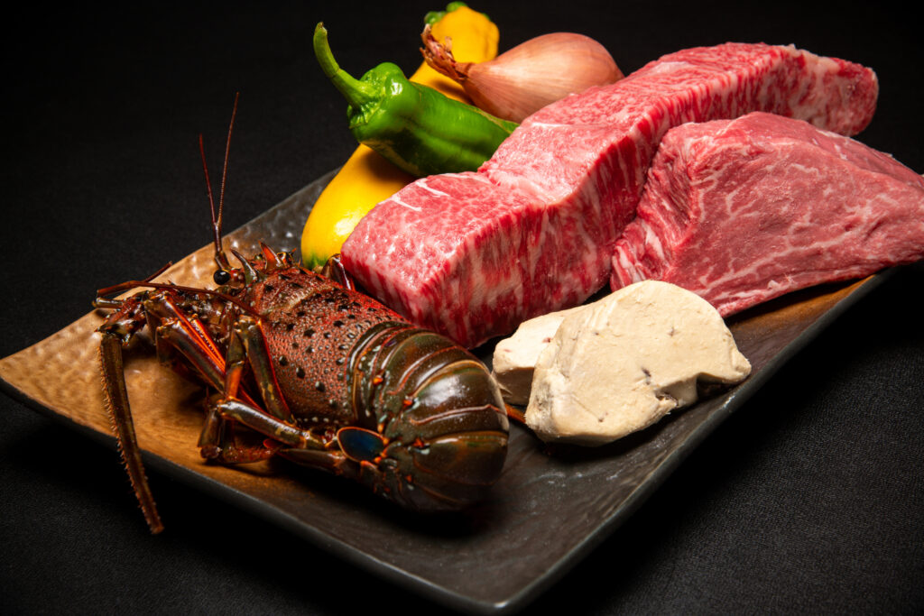A5のフィレとサーロインの盛合せ、伊勢海老にフォアグラ、鮑など